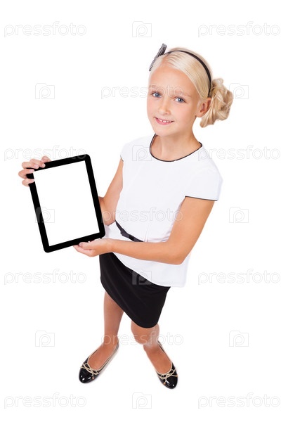 Школьница с планшетом в руках смотрит в камеру и улыбается