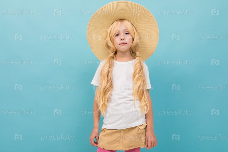 Маленькая красивая девушка с длинными светлыми волосами, заплетенными в хвосты, в большой светлой шляпе на синем фоне