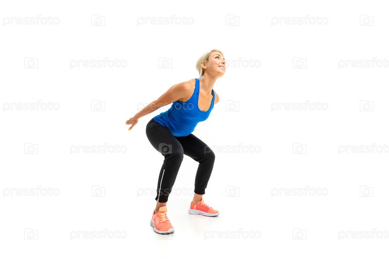 Европейская спортивная блондинка приседает на белом фоне