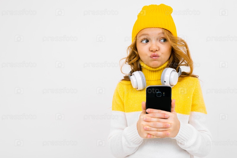 Европейская милая девушка с большими наушниками и смартфоном слушает музыку и гримасничает на белом фоне