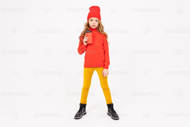 Европейская милая девушка в красном позирует со стаканом кофе в руках на белом фоне