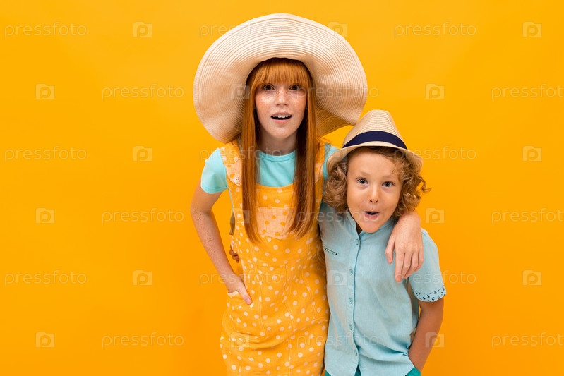 Два удивленных рыжеволосых брата и сестры смотрят в летние шляпы, смотрят в камеру на желтом фоне
