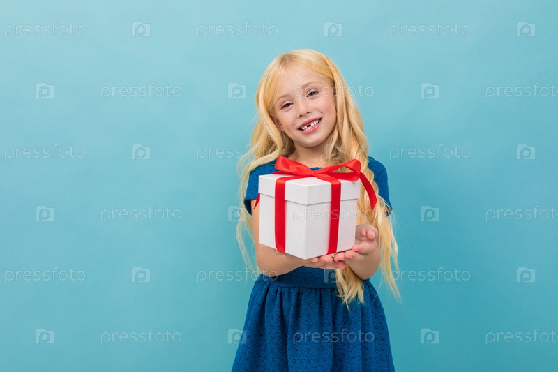 Красивая кавказская девушка держит белую коробку с подарком и имеет много эмоций на синем фоне