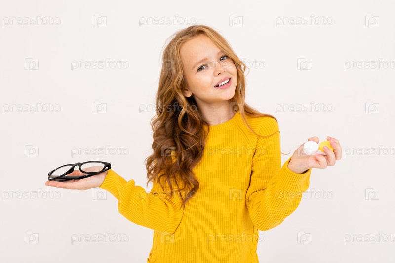 Молодая девушка держит в руке контейнер для линз и очков на белом фоне студии