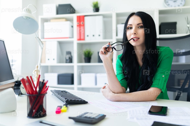 Молодая девушка сидит в офисе за столом и держит в руках очки