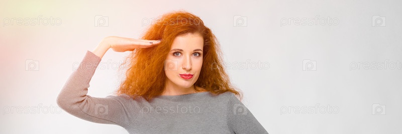 Очаровательная молодая девушка с рыжими волосами. Молодая девушка в сером свитере. Молодая девушка на сером фоне. Молодая девушка положила руку на голову