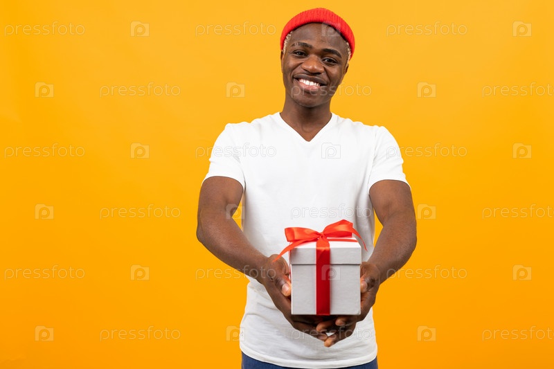 Милый темнокожий американец с улыбкой в белой футболке протягивает подарочную коробку с красной лентой на желтом фоне с копией пространства