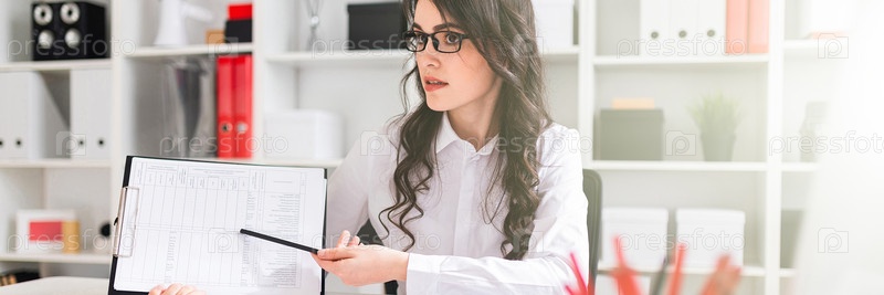 Красивая молодая девушка сидит за столом в офисе и указывает карандашом на информацию в документе