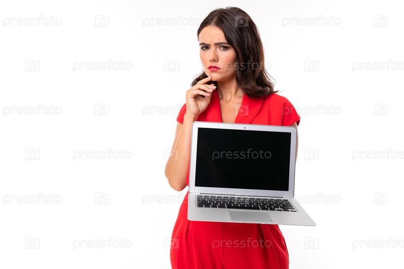 Портрет красивой кавказской девушки работает с ноутбуком на белом фоне
