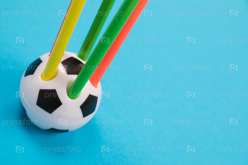 Круглая чашка для карандашей в форме футбольного мяча с пятью цветными карандашами на лазурной поверхности изолирована