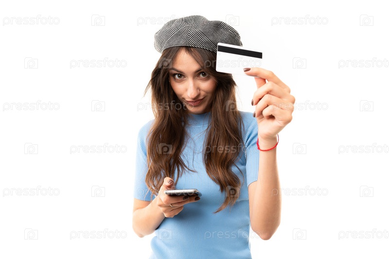 Веселая женщина с длинными волосами держит денежную карту и телефон на белом фоне