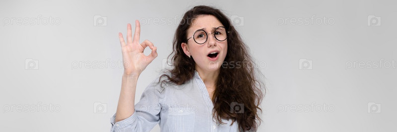 Портрет молодой девушки в очках. Красивая молодая девушка на сером фоне. Девушка показывает знак оккес