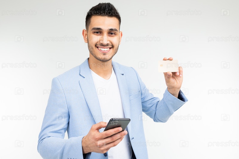 Красивый бизнесмен в синей куртке с кредитной картой с макетом и смартфоном в руке на фоне белой студии