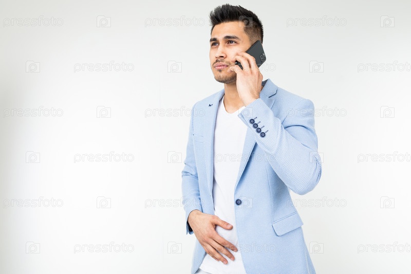 Портрет бизнесмена в синей куртке, серьезно разговаривающего с партнерами на белом фоне
