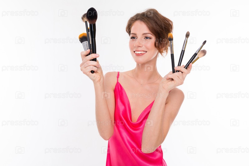 Девушка демонстрирует свой арсенал кистей для макияжа