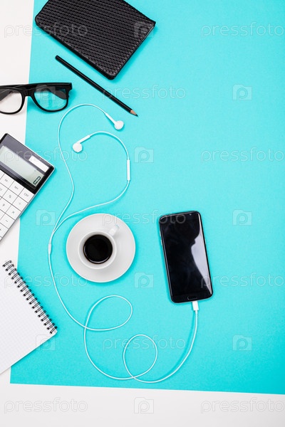 Школьные и офисные принадлежности, такие как заметки, ручки, карандаши, калькулятор, кисть, ножницы, кофе, ноутбук, аккуратно лежат на бело-синем фоне
