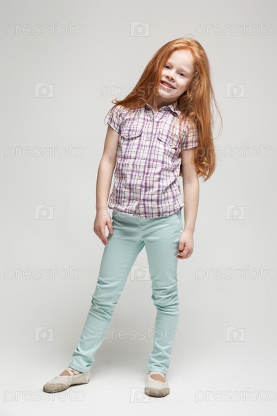 Вертикальное изображение, изолированное на серой, красивой милой кавказской рыжеволосой девочке в клетчатой рубашке, ярко-синих брюках и белых сапогах, смотрите в камеру