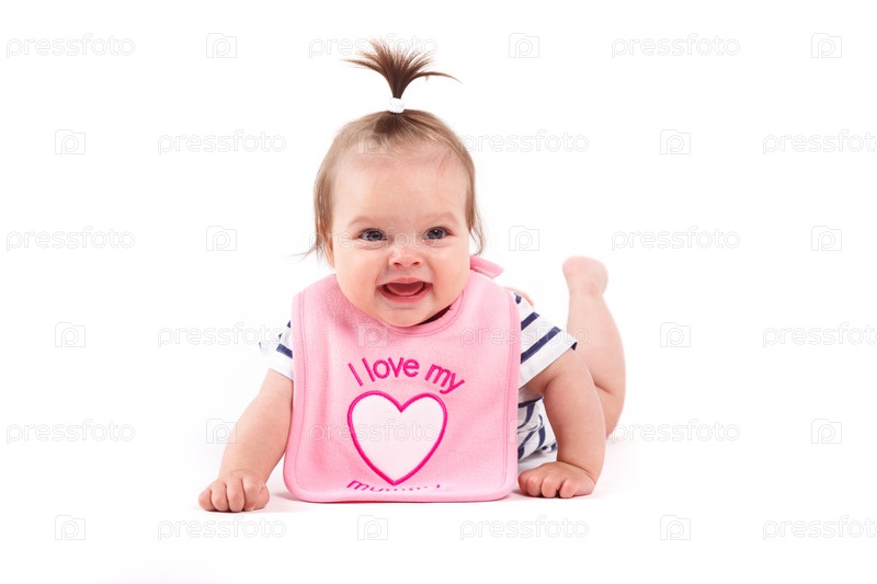 Милая веселая маленькая девочка в розовом нагруднике