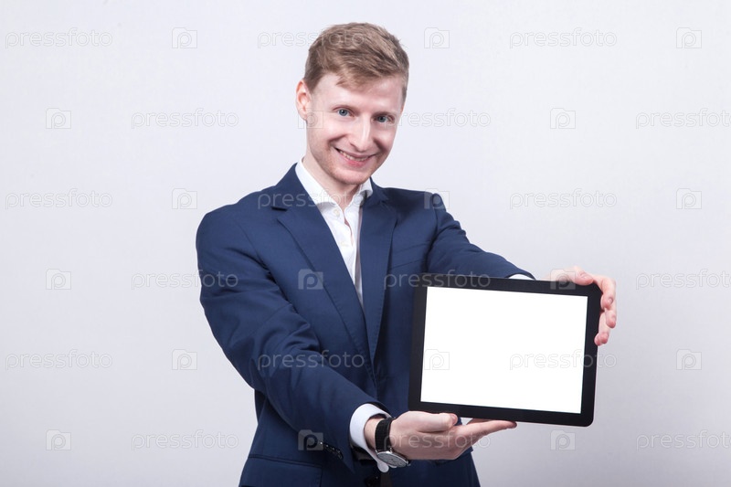 Молодой студент в синей куртке на белом фоне держит экран планшета вперед и улыбается