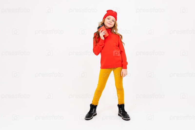 Европейская милая девушка в красном позирует со стаканом кофе в руках на белом фоне