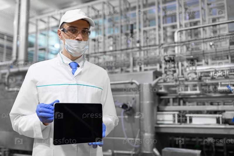 Место для письма. Технолог в маске, перчатках и белом халате стоит с планшетом с пустым экраном на заводе. Мужчина с цифровым планшетом в униформе в производственном цеху