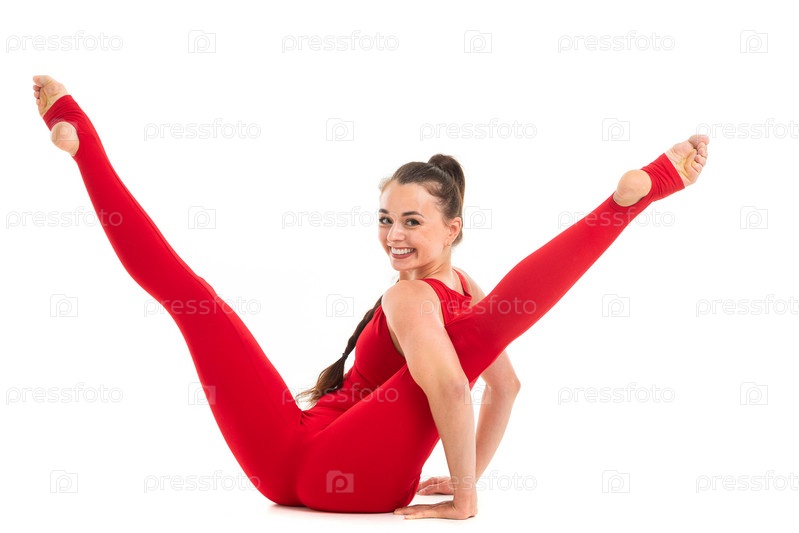 Девушка в спортивном комбинезоне красного цвета на белом фоне показывает растяжку, расставив ноги в стороны
