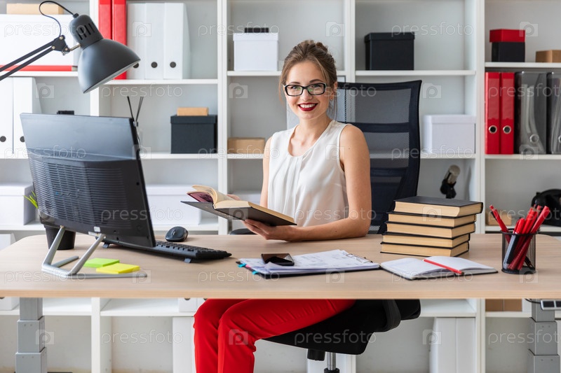 Красивая молодая девушка в очках и белой блузке работает в офисе. фото с глубиной резкости