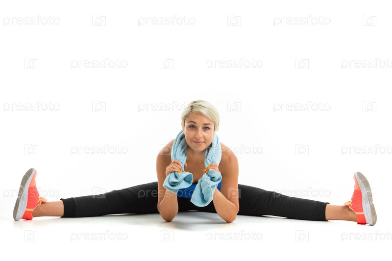 Молодая спортивная девушка со светлыми волосами в черном спортивном топике, черных леггинсах и ярких кроссовках делает растяжку мышц