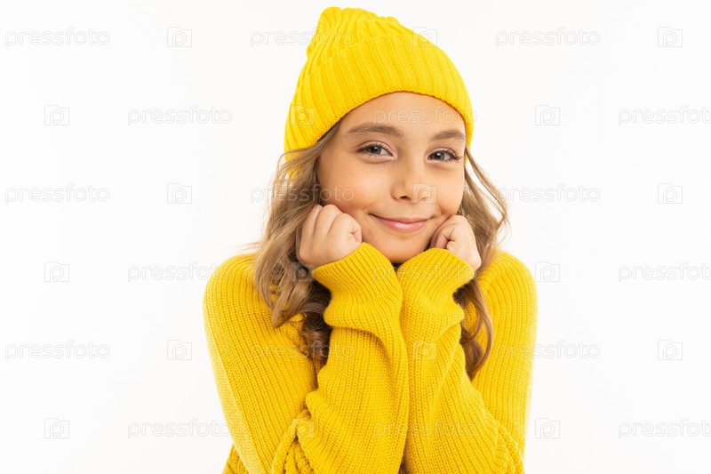 Милая молодая девушка рассказывает улыбаясь на фоне белой студии