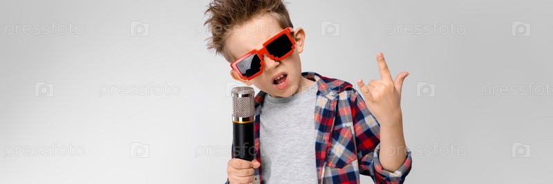 Очаровательный счастливый ребенок на сером фоне, волосы подняты