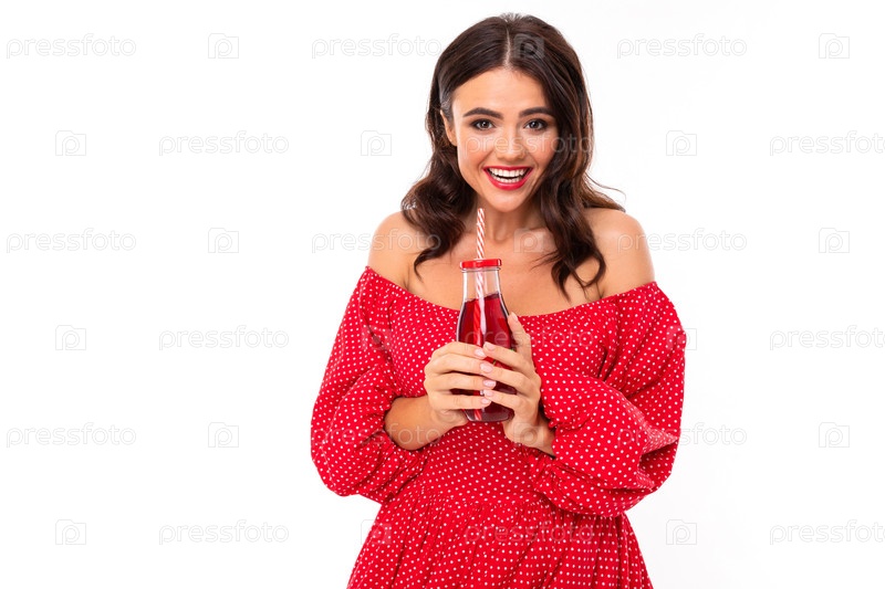 Красивая молодая женщина с идеальной улыбкой пьет клубничный сок, выделенный на белом фоне