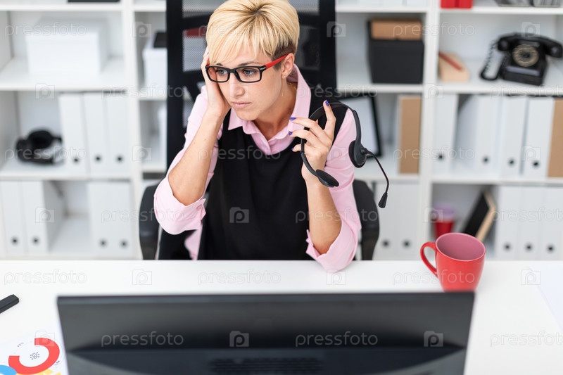 Молодая девушка сидит за компьютерным столом и держит его руку за щеку