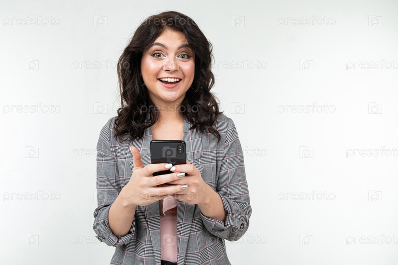 Брюнетка девушка занимается серфингом в Интернете, держа телефон в руках на белом изолированном фоне
