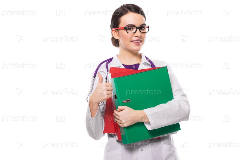 Портрет молодой привлекательной женщины-врача в белом халате, стоящей в офисе, улыбающейся, смотрящей в камеру, показывающей хорошо и держащей в руках буфер обмена, уверенной в себе, опытной, дружелюбной, умелой, позитивной, веселой, успешной брюнетки, ка