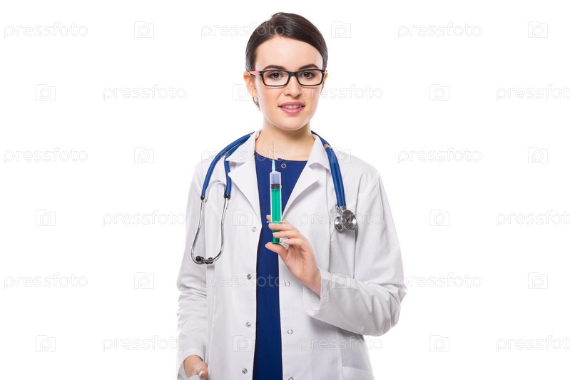Молодая женщина-врач со стетоскопом держит шприц в белой форме на белом фоне