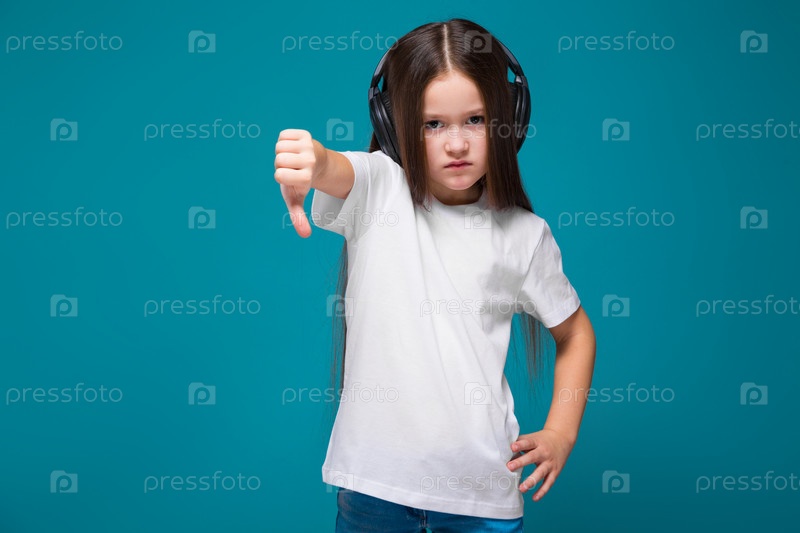 Изолированный на голубом, привлекательный кавказский брюнет в белой футболке, синих джинсах и черных наушниках с длинными волосами, злой, несчастный, показывает палец вниз