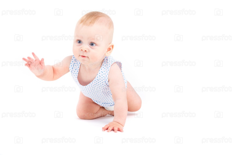 Изолированный на белом, милый счастливый кавказский мальчик в пятнистой рубашке, пытается проползти