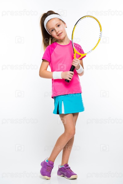 Очаровательная улыбающаяся маленькая девочка, смотрящая в камеру в спортивной одежде, держащая в руках теннисную ракетку на белом фоне брюнетка кавказская красивая привлекательная дружелюбная изолированная