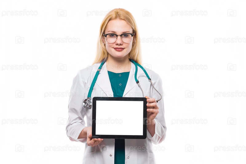 Портрет женщины-врача в белом халате носит стетоскоп и очки, изолированные на белом фоне с копирайтом, держит цифровую концепцию сети медицинских технологий планшетного компьютера