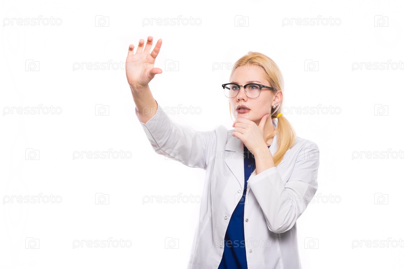 Портрет умной вдумчивой женщины-врача в белом халате и очках тщательно осматривает что-то в руках и подпирает подбородок, изолированный на белом фоне с копирайтом