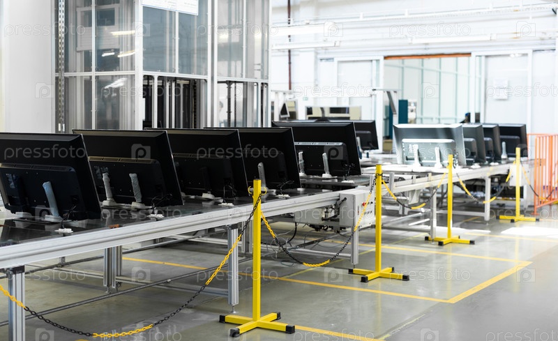 Конвейер для производства телевизоров. Тестирование телевизоров в мастерской. Линия сборки электроники