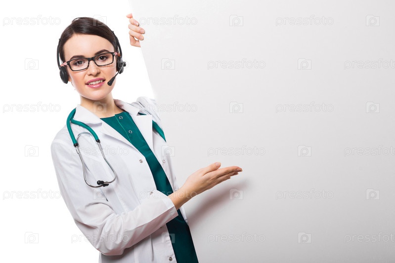 Портрет молодой привлекательной женщины-врача в белом халате в очках, улыбающейся, смотрящей в камеру с наушниками, показывающими на рекламном щите с пустой карточкой, консультирующей уверенную дружелюбную опытную профессиональную умелую позитивную веселу