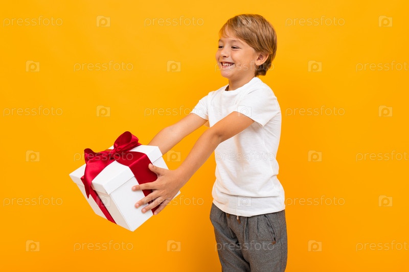 Кавказский мальчик держит белую коробку с подарком и радуется, портрет изолирован на синем фоне