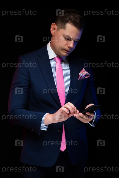 Портрет уверенного в себе красивого серьезного элегантного бизнесмена, держащего телефон в руках на черном фоне