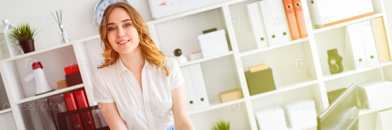 Красивая молодая девушка стоит в офисе, руки на столе