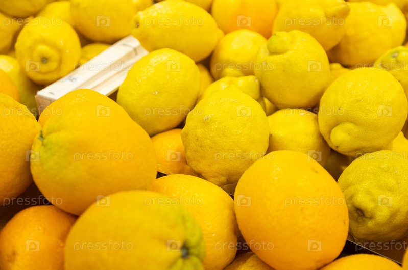 Свежие ярко-желтые лимоны в деревянных ящиках на фермерском рынке или в продуктовом магазине крупным планом. Может использоваться для фона. Вид сверху