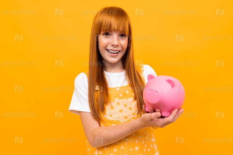 Рыжеволосая девушка держит в руках копилку на желтом фоне