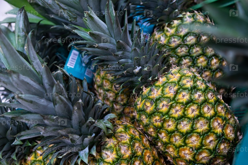 Пара экзотических вкусных ананасовых фруктов на рыночном подносе, вид по диагонали