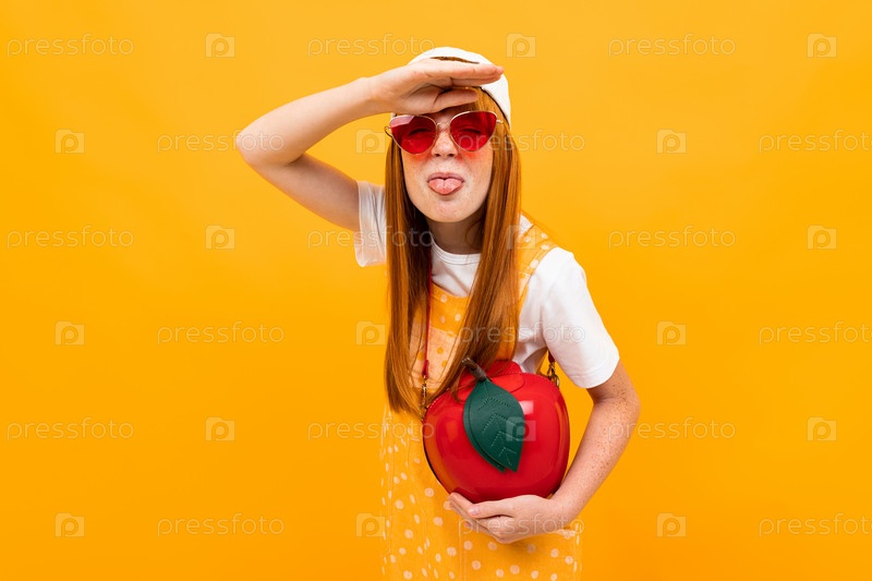 Рыжеволосая девушка в очках и с красной сумочкой в форме яблокапоказывает язык на желтом фоне