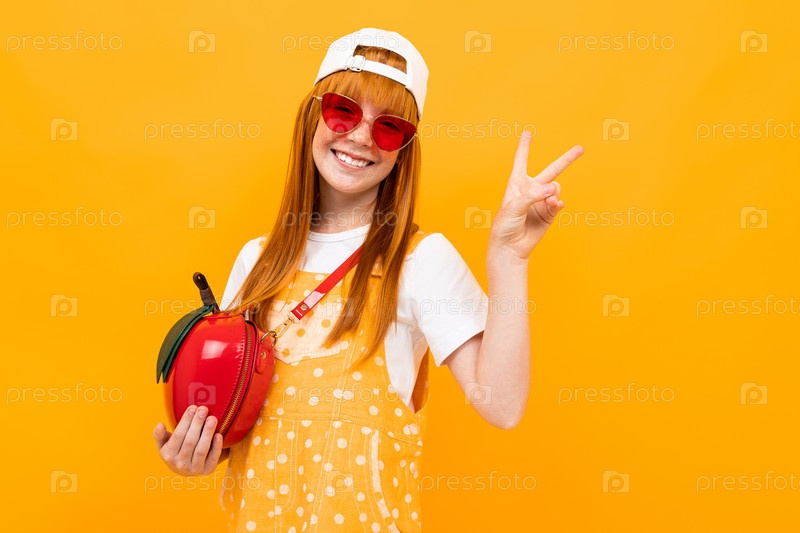 Стильная рыжеволосая девушка с красной сумочкой в форме яблока на желтом фоне